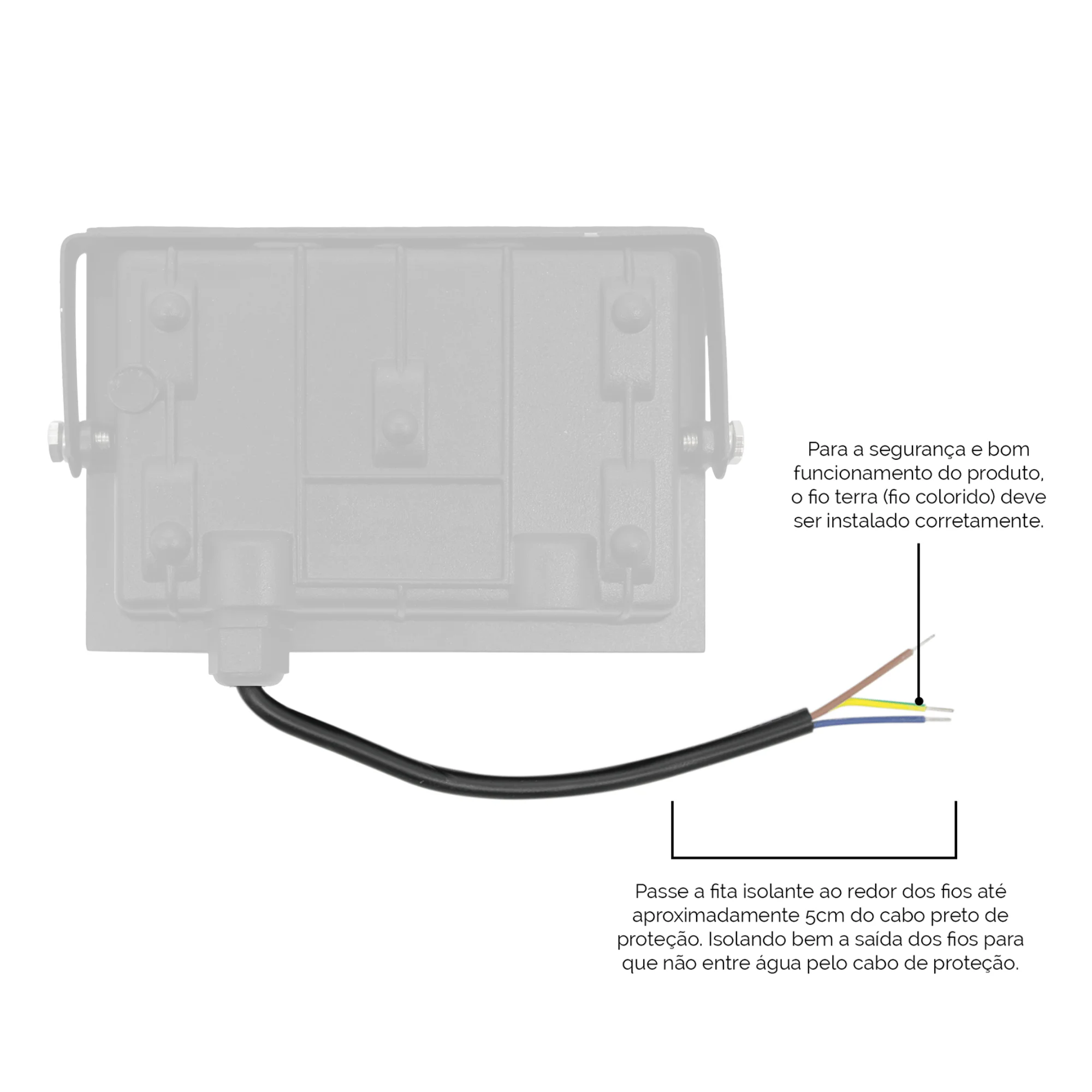 O fio terra (bicolor) deve ser utilizado corretamente na instalação, para que não haja possibilidade de danos futuros ao refletor causados por instabilidade elétrica. A não instalação ou instalação incorreta do fio terra acarreta a perda da garantia, pois se trata de mau uso do material e não de defeito de fabricação.